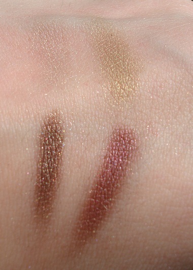 Mystic Moss: olive with golden shimmer; in its dry version the colour is very much like to the olive cream eyeliner (line on the right of the eyeshadows swatch above) while, as wet, it's a gorgeous golden green.