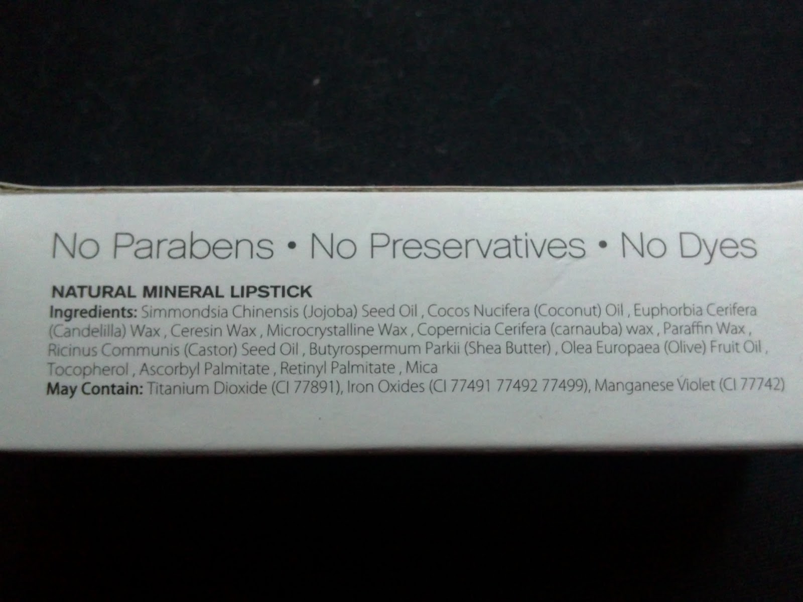 www.eyeslipsface.co.uk describes the mineral lipsticks as being longlasting, parabens, preservatives and chemical dyes free and containing a nourishing blend of exotic oils, natural waxes, vitamins and plant extracts to moisturize your lips.