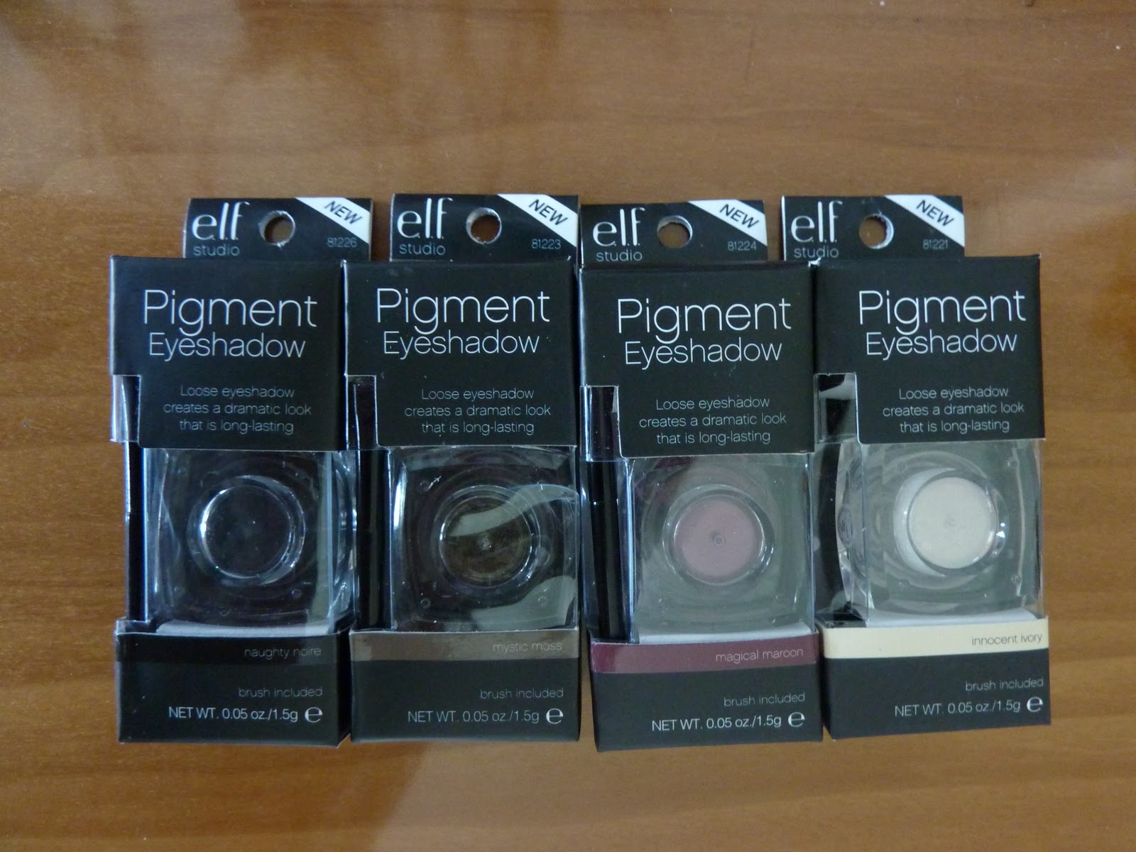 Yes yes yes!! My elf order with the new products has arrived! In this post I show you some photos of the 4 Studio pigments: Naughty Noir, Mystic Moss, Magical Maroon and Innocent Ivory. Each jar, which has the same size of the cream eyeliners one, contains 1,5g of pigments. Just like the cream eyeliners box it comes with a little brush, not angled but just like the one you can find in the eye transformer palette or the corrective concealer, useless to apply the eyeshadow. Each jar is sealed both with a sifter and a label to prevent the powder to be scattered everywhere.